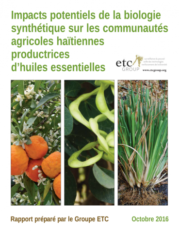 La biologie synthétique est employée pour créer une plateforme destinée à la production d’arômes et de fragrances prétendument « naturelles » — incluant les huiles essentielles extraites à partir de plantes retrouvées en Haïti. Les entreprises de biologie synthétique visent à produire de petites quantités de composés aromatiques ou odoriférants à forte valeur ajoutée à partir de microorganismes modifiés, qu’elles présentent comme étant une solution de rechange aux coûteux produits végétaux importés ou à leurs succédanés obtenus par synthèse chimique. Prenant acte de cet état de choses, le présent rapport de recherche tente de répondre aux deux questions cruciales suivantes : Le marché haïtien des huiles essentielles est-il menacé par les travaux actuels de R et D dans le domaine de la biologie synthétique? Les modes de subsistance des communautés agricoles haïtiennes sont-ils compromis par ces progrès?