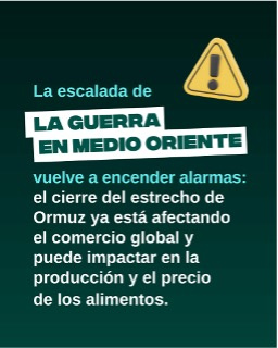 Fertilizantes como amoníaco, fosfatos y azufre provienen en gran medida de países del Golfo, y casi la mitad de la urea comercializada a nivel mundial, el fertilizante nitrogenado más utilizado, se produce en esta región. Cualquier interrupción en esta ruta enciende las alarmas por el limitado acceso a fertilizantes y por su impacto en la producción agrícola.